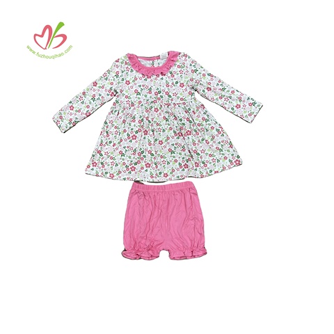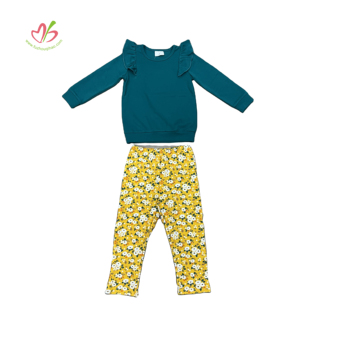 ملابس أطفال مطبوعة من خشب البامبو مخصصة طقم ملابس للأطفال منفوش الرقبة طقم ملابس ربيعية زهرية طقم ملابس للأطفال من قطعتين